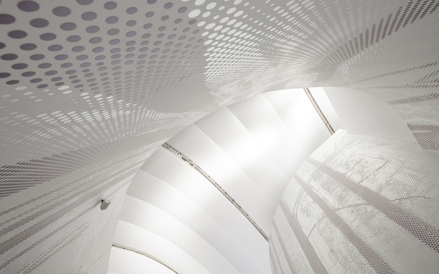 Die Gebäudehülle des Luxemburg Pavillons auf der Expo 2020 in Dubai ist ein weißes Möbiusband, das in der Nacht leuchtet. Die Architektur spielt damit auf die Unendlichkeit und Regenerationsfähigkeit der Natur an.